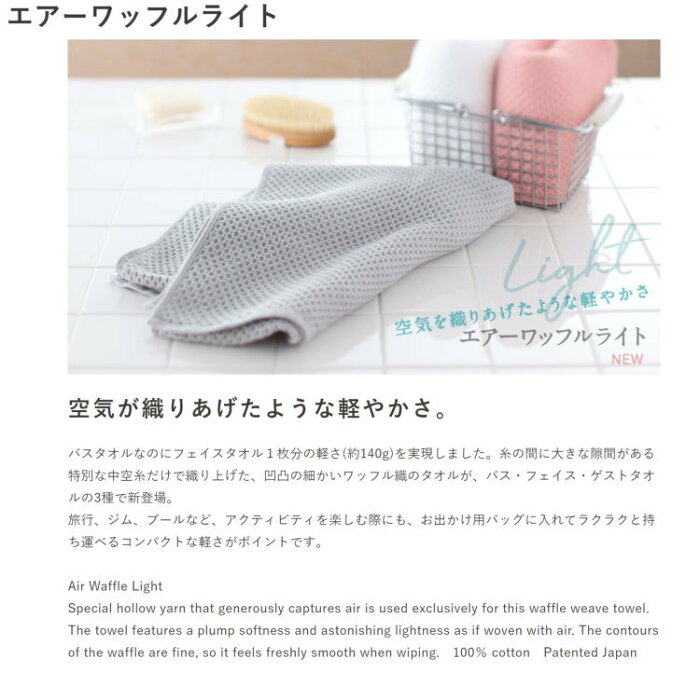Air Waffle Light Special hollow yarn that generously captures air is used exclusively for this waffle weave towel. The towel features a plump softness and astonishing lightness as if woven with air. The contours of the waffle are fine, so it feels freshly smooth when wiping. 100% cotton Patented Japan - 空気が織りあげたような軽やかさ - エアーワッフルライトとは? まるで空気を織り込んでいるかのような驚くほどの軽さと、ふっくらとした柔らかさが特徴の、糸の間に大きな隙間がある特別な中空糸だけで織り上げた、凹凸の細かいワッフル織のタオルです。