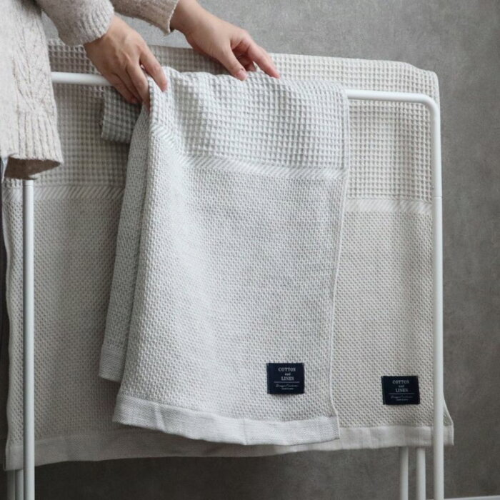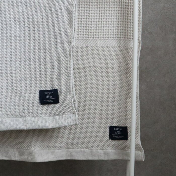 縦糸にコットン、横糸にリネン(麻)をそれぞれ100%使用しているので、 リネンの独特なシャリ感と吸水性を感じつつ、コットンの肌なじみの良さがわかる贅沢なアイテムです。