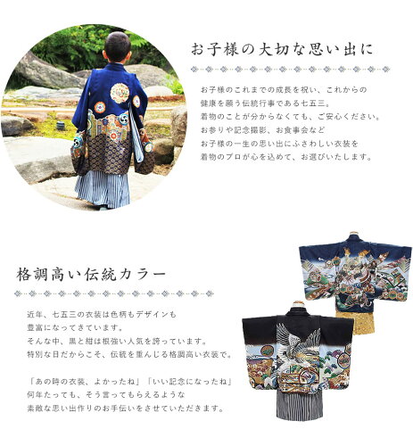 七五三のお参りや記念撮影、おじいちゃんおばあちゃんへのお披露目など、お子様の大切な1日を、とびきりの衣装で思い出に残しませんか? 【羽織】カラーは黒色か紺色。