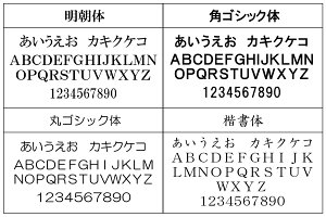名入れの文字は、【明朝体】・【ゴシック体】・【丸ゴシック体】・【楷書体】からお選び頂けます。