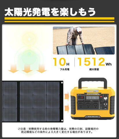 定額:1500W(瞬間最大3000W) 容量:1512Wh /420000mAh 素材 :リチウム サイズ :長さ35CMx幅26.5CMx高さ24CM 重量 :13.28KG 充電温度範囲 :0-40°C 放電温度範囲 :-10-40°C フル充電サイクル回数 :500回繰り返して80%まで維持 【充電について】 家庭コンセント:300Wの場合約4.5~5.5時間。