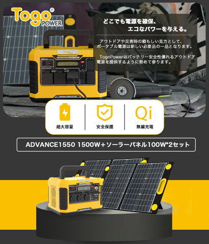 カーチャージャー: 600Wの場合約24.5~25.5時間 ソーラーチャージャー:200Wのソラーパネルの場合7.5~8.5時間 【安心保証&TOGOPOWER正規取扱店】 Togo Power ADVANCE1550ワイヤレス給電の国際標準規格QI認証済みポータブル電源として過充電や過放電を防止するバッテリーマネジメントシステム(BMS)を搭載しております日本のPSE(電気用品安全法)やUN38.3(国連勧告輸送試験)の認証を取得しております。
