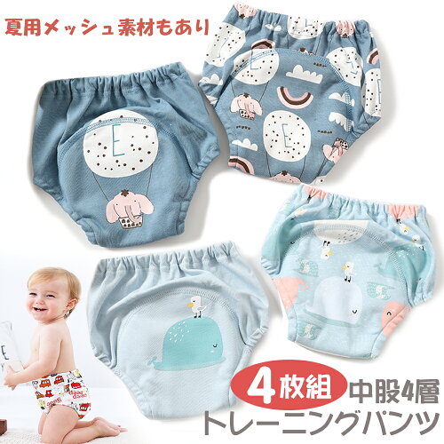 BRILBE 夏用 メッシュ素材 トレーニングパンツ 4層 4枚組 男の子 女の子 90 100 110 おねしょ パンツ ガーゼ 防水層付 おねしょ ズボン 吸水性改良 おねしょ対策 通気性 トイトレ トレパン 布おむつ キッズ ベビー メッシュ素材 棉100%