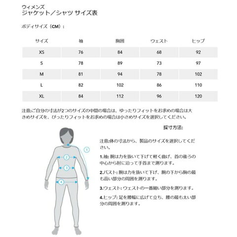 サイズ:胸囲:ウエスト:ヒップ:裄丈(cm) XS:84:68:92:76 S(Men's XS相当):89:73:97:78 M(Men's S相当):94:78:102:81 L(Men's M相当):102:86:110:82 発送はゆうパック60サイズとなります。
